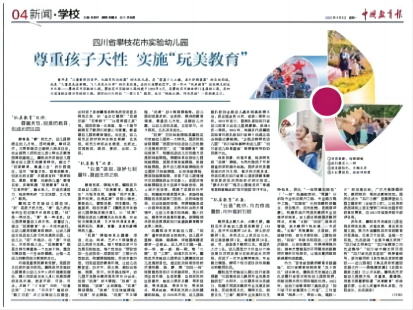 2023年4月3日《中国教育报》刊登《攀枝花市实验幼儿园——尊重孩子天性 实施“玩美教育”》一文,专题报道了攀实幼在35年办园历程中教育改革的实践与探索,通过“玩美教育”之源、“玩美教育”之要、“玩美教育”之基,顺天性、启童真、激潜能,用爱与智慧耕耘着“玩美教育”的希望田野,让幼儿的童年快乐多姿,向阳成长,如花绽放!