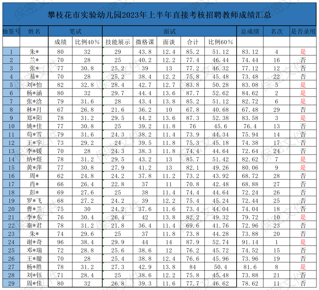 根据《2023年攀枝花市事业单位春季引才公告》和《攀枝花市实验幼儿园2023上半年直接考核招聘教师实施方案》,幼儿园已完成相关考核,现将考核结果公布如下: