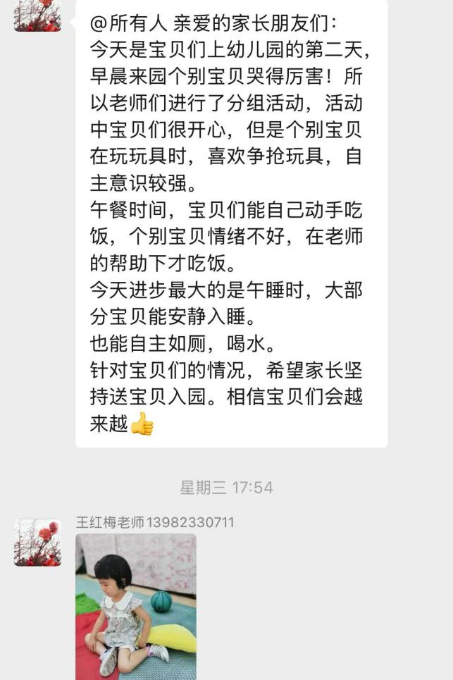 空闲时,教师发送孩子们玩玩具的片段,配文 “看,豆豆的小手动得多灵活!”