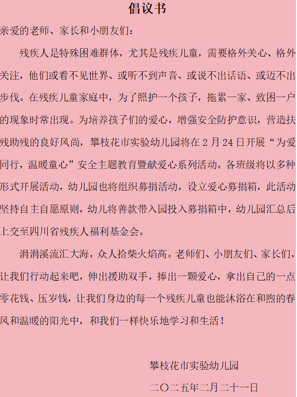 为了传承雷锋精神,把爱传递给身边的人,培养孩子们的爱心,增强安全防护意识,营造扶残助残的良好风尚,攀枝花市实验幼儿园向全园师幼和家长发起了倡议,在2-3月开展了“为爱同行 温暖童心”爱心募捐暨安全教育活动。
