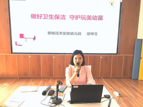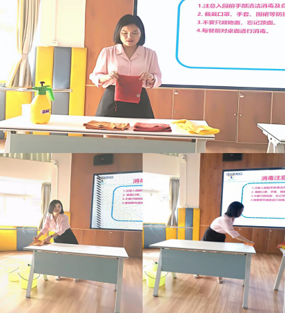 讲解结束后,邵园长还现场示范了不同浓度消毒液的配制方法和教室桌面清洁消毒的标准步骤,让保育员们对卫生消毒工作有更直观、更深刻的认识。